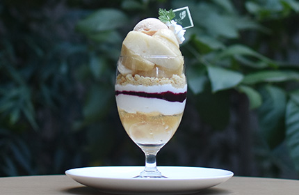 冬に食べられることや、生産量が少なく希少価値の高い白桃「冬美白」を存分に使用し、その香り高く濃厚な甘さを味わえる贅沢なパフェ。